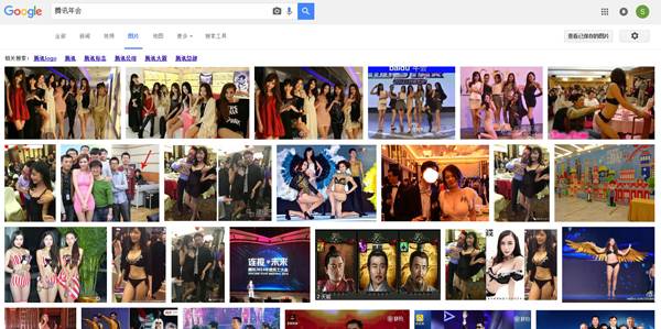 텐센트의 연례 행사는 그저 빙산의 일각일 뿐이다. 글로벌 검색 포털 구글에 '텐센트 연례 행사'를 검색하면, 일본 AV 사이트에 온 것처럼 대부분의 사진이 살색으로 도배돼 있다. 반 나체에 가까운 여성의 차림과 천박한 표정을 짓고 있는 남성 직원들의 모습이 적나라하게 나타난다.