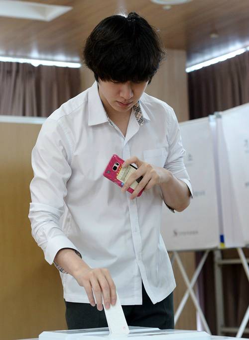 김희철은 투표 당시 투표용지를 투표함을 넣는 모습이 사진기자에 포착됐다.