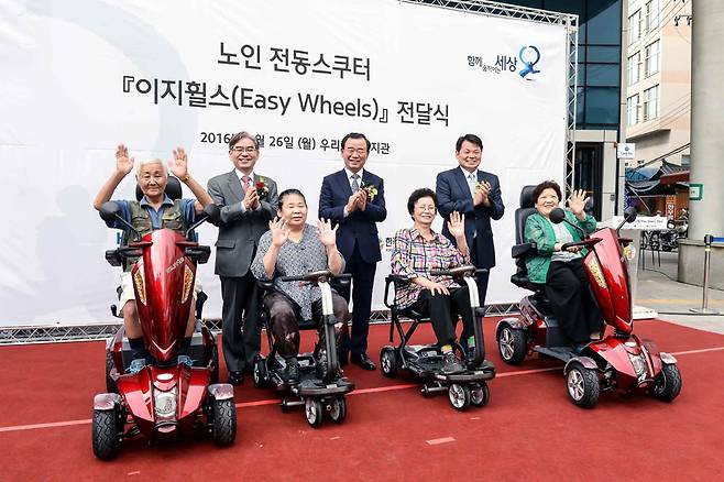 현대자동차그룹은 ‘2016년 노인의 날’을 기념, 26일 서울 우리마포복지관에서 박광식 현대자동차 부사장, 박찬봉 사회복지공동모금회 사무총장, 이호경 한국노인복지관협회 회장, 박소현 우리마포복지관 관장 등이 참석한 가운데 노인용 전동스쿠터 ‘이지휠스’ 전달식을 개최했다.