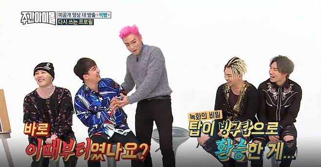 8일 방송된 MBC 에브리원 예능프로그램 <주간아이돌> 289회에서는 입대를 하루 앞둔 탑을 위한 ‘빅뱅 스페셜’ 영상이 공개됐다.