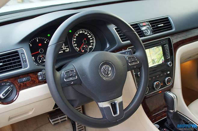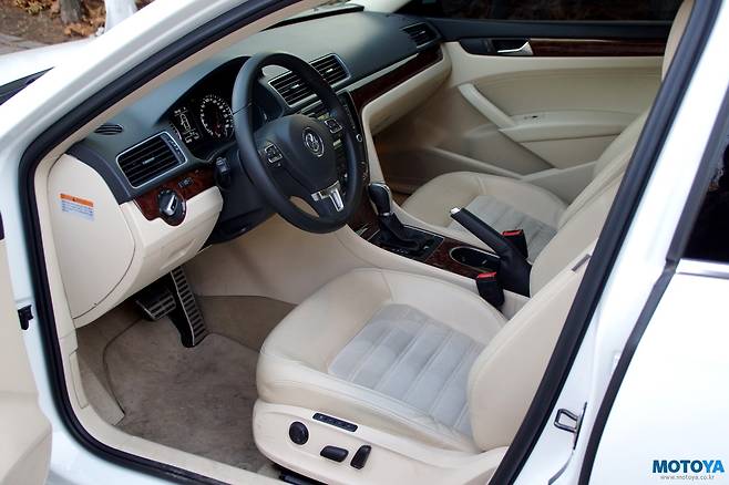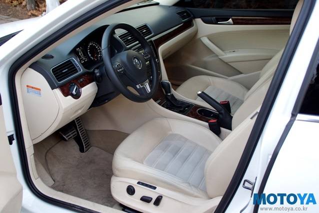 파사트 2.0 TDI의 도어를 열어 젖히면 화사한 톤의 베이지 컬러 인테리어가 운전자를 맞는다. 폭스바겐 특유의 명료하고 정갈한 인테리어 디자인과 잘 어우러져 있어, 시각적인 만족감을 주는 부분이다. 그러나 이런 컬러의 인테리어는 모노톤으로 이루어진 인테리어 보다 필연적으로 관리에 손이 많이 가게 되는 것이 단점으로 작용할 듯 하다. 구두 자국 같은 오염에 취약하기 때문이다.
