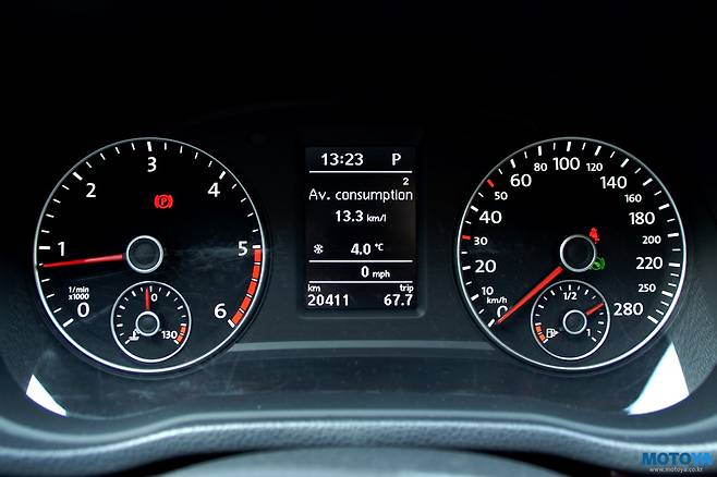 인스트루먼트 패널도 간단하고 명료한 디자인이다. 폰트가 깔끔하고 가독성이 우수하다. 중앙의 액정 모니터에는 트립 컴퓨터 및 연비, 정비 주기 등의 각종 차량 정보를 표시한다. 운전 중의 조작은 불가능하고 정차 시에만 조정이 가능하다.