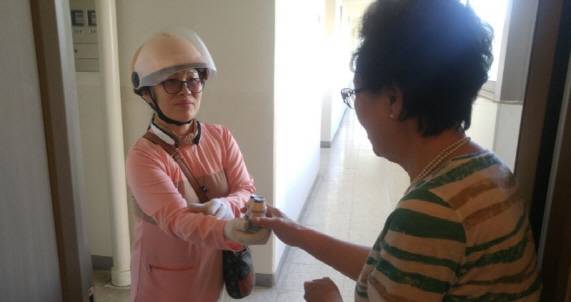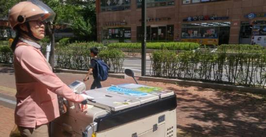 이 씨는 햇빛을 피하려고 길가에 펼쳐뒀던 파라솔을 접었다. 전동카트를 타고 3분여 거리를 달렸다. 한 임대아파트에서 정차했다. 전동 카트의 뚜껑을 열고 요구르트를 2개씩 작은 봉지에 담았다. 익숙한 듯 아파트 중앙 현관문 비밀번호를 누르고 곧장 4층으로 올라갔다. 벨을 누르니 할머니 한 분이 반갑게 맞았다.