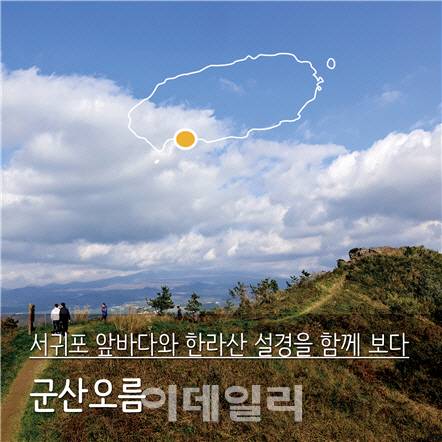 겨울 속으로 숨어버린 한라산. 하얀 설경을 그림자처럼 드리우고 사라진 바람에 겨울의 한라산은 어느 때보다도 더 빛난다. 이런 한라산의 겨울 풍경과 서귀포 앞바다를 동시에 볼 수 있는 오름이 있다. 바로 군산 오름이다. 산방산, 중문 시내와 바다, 한라산을 모두 볼 수 있고, 사방을 둘러보며 제주 전체의 풍광을 볼 수 있어 패러글라이딩을 즐기는 사람들이 자주 이곳에 오르기도 한다. 특히 일출과 일몰을 모두 감상할 수 있는 오름이라는 점에 많은 사람들의 사랑을 받고 있다.