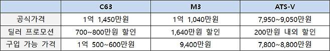 한가지 짚고 넘어가야 할 부분은 딜러의 할인정책이다. M3는 무려 1,600만원 이상의 할인이 가능하다. 역시 ‘폭풍 할인의 BMW’답다. 금융 상품 이용시 조금 더 할인될 가능성도 있다. C63의 경우 벤츠로서 할인율이 큰 편이었다. 반면 ATS-V는 할인 폭이 가장 적었다. 이미 1차 수입물량 20대가 완판된 상황이니 할인율을 높일 필요가 없었을 것이다. 현재 ATS-V를 구매하기 위해서는 사전예약 후 2차 수입물량을 기다려야 한다.