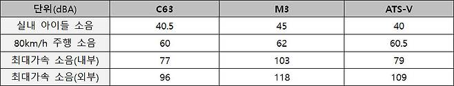 정숙성도 비교했다. 그 결과 C63이 가장 뛰어났다. 배기량이 가장 크고 AMG 특유의 배기사운드가 부각됐음에도 위와 같은 결과가 나온 것이다. C63의 소음은 아이들 상태나 시속 80km로 주행중인 상황에서 일반 가솔린 차량과 크게 차이 나지 않았다. 최대 가속이 전개되는 상황에서는 AMG 특유의 사운드가 강조되지만 멀리 울려 퍼지지 않았다. 운전자는 배기사운드를 즐길 수 있지만 남들에게는 피해를 주지 않는 것이다.