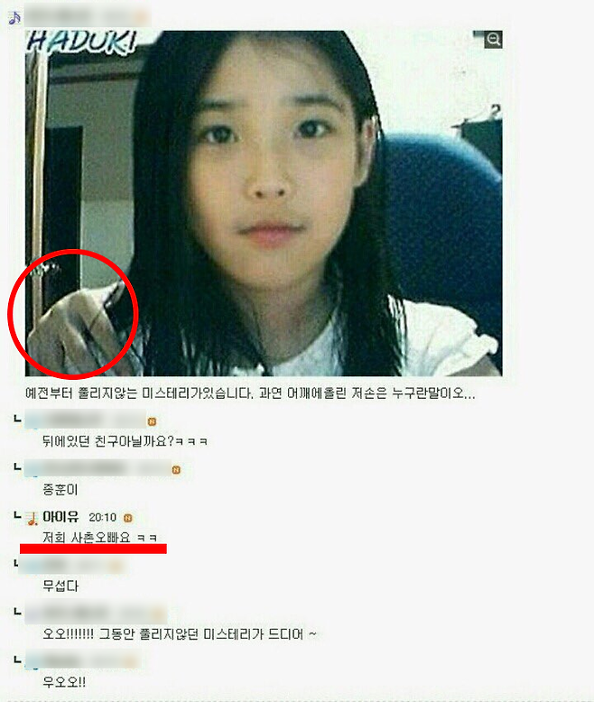 사진 속에는 책상에 앉아 찍은 사진으로 추정되는 앳된 아이유의 모습이 담겨 있다. 그런데 사진이 어딘가 이상하다. 아이유 오른쪽 어깨에 정체를 알 수 없는 손이 올려져 있었기 때문이다. 해당 사진은 과거부터 꾸준히 '아이유 하두리 사진의 미스터리'라는 제목으로 SNS에서 확산되며 궁금증을 자아냈다.