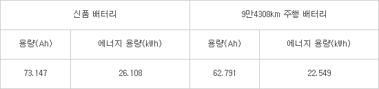 시험 대상 차량 배터리의 물리적 용량(정격용량 22㎾h)은 출고 당시 27㎾h이고, 시험에선 22.5㎾h의 전기에너지를 사용할 수 있는 것으로 나왔다. 22㎾h 배터리의 환경부 인증 1회 충전 주행 거리가 135㎞인 것을 고려하면 이 배터리로도 거리 손실 없이 신차 수준 주행이 가능하다.