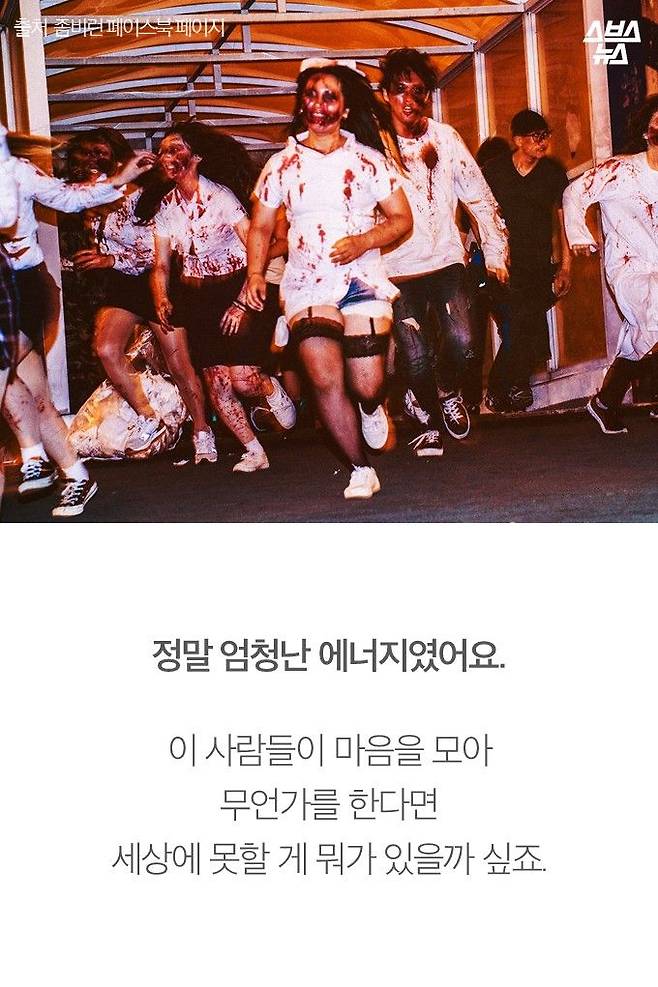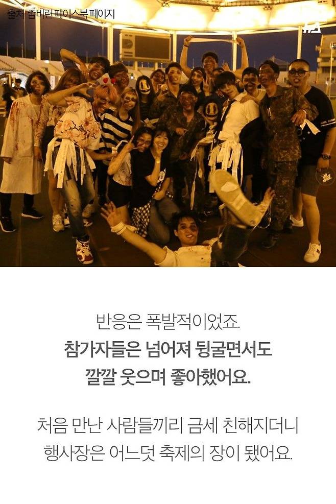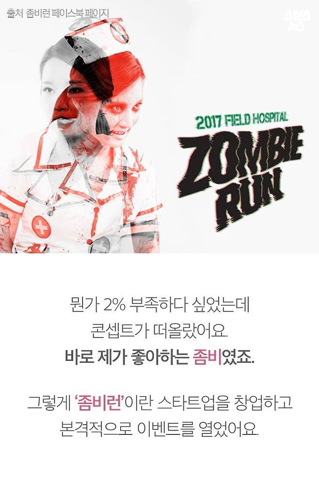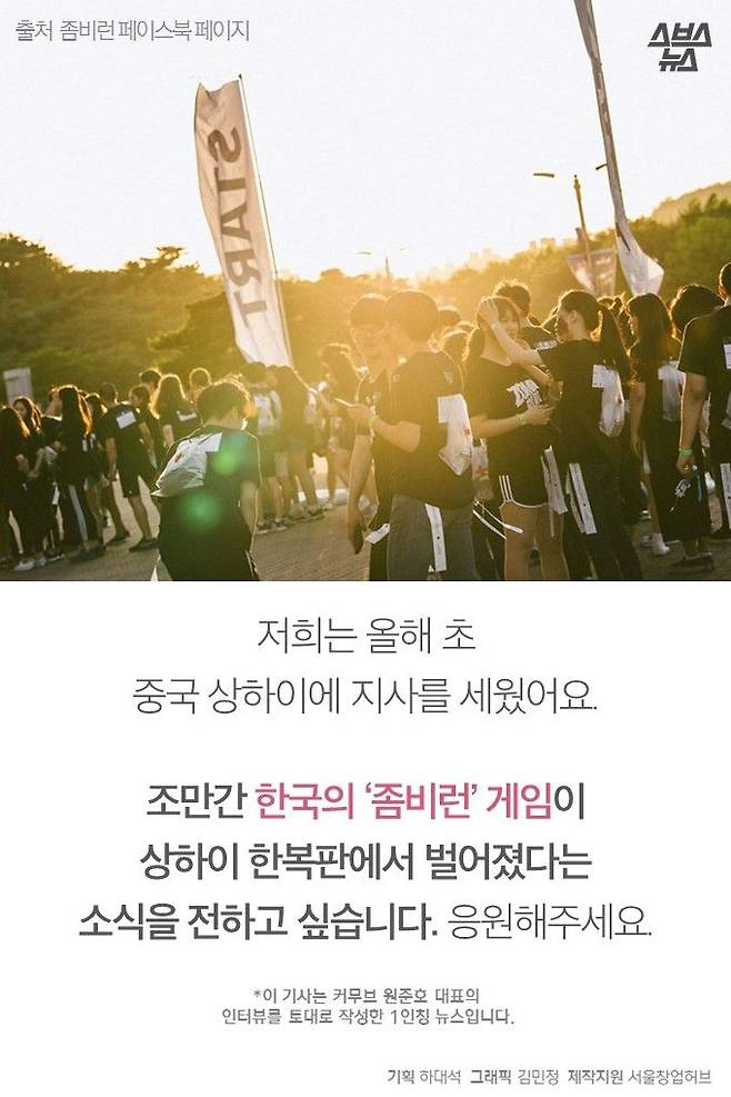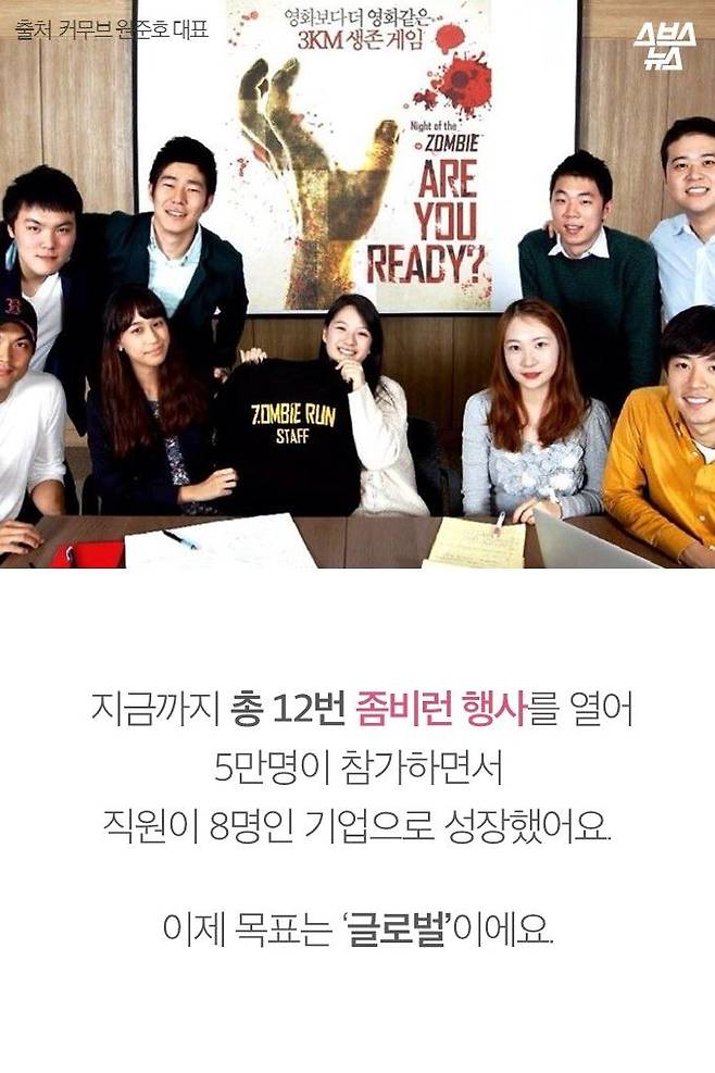 대학시절, 좀비처럼 지내다 5만명의 '좀비군단'을 이끌게 된 청년이 있습니다. 커무브 대표 원준호 씨는 좀비처럼 분장하고 뛰어다니는 '좀비런 게임'의 창시자입니다. 지금까지 12번 좀비런 행사를 열며 점점 사업을 확장한 그는 내일(21일) 개관할 서울창업허브에 입주할 예정입니다. 이제 글로벌 진출까지 노리는 스타트업의 대표가 된 원준호 씨가 후배들에게 할 말이 있다고 합니다.