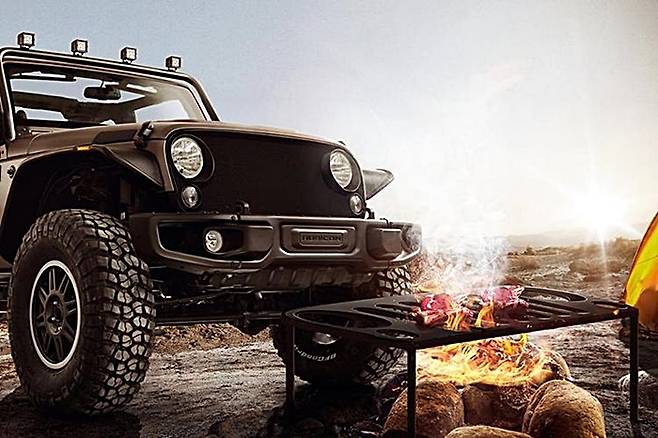지프는 랭글러의 프론트 그릴을 제대로 활용할 수 있는 방법을 내 놨다. 오프로드 성격이 강한 지프 랭글러의 프론트 그릴을 바베큐에 쓰고 있는 사진은 센스가 넘친다. 바베큐에 안성맞춤인 그릴이어서 거짓말이라기 보다는 실제 사용에 무리가 없어 보일 정도다. 양쪽 헤드라이트는 냄비를 올려 국물요리를 해도 될 것처럼 보여진다.