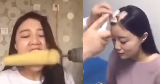 다양한 인증 영상이 올라온 가운데 단연 화제가 된 건 한 여성이 촬영한 영상이다. 긴 생머리를 한 그는 친구의 도움을 받아 드릴 옥수수 먹기에 도전했다. 그러던 중 앞머리가 서서히 흘러내렸고 급기야 드릴에 휘감겨 순식간에 몽땅 빠져버린다.