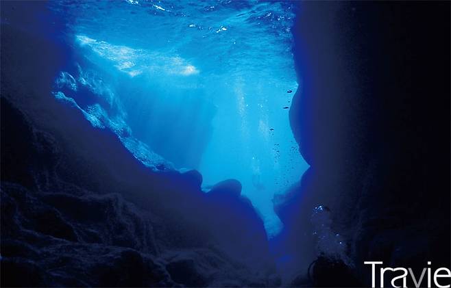 첫날 다이빙은 50인승 다이빙 전용선으로 나하항을 출발해 케라마 제도 서쪽 끝에 위치한 구바섬(久場島)에서 시작했다. 야자수가 늘어선 풍경이 아니라 암석으로 이루어진 섬 풍경은 색다른 ‘탐사 분위기’를 고조시켜 주었다. 30명이 넘는 다이버들이 팀별로 입수한 후 우리도 첫 포인트를 향해 물속으로 뛰어들었다. 시작부터 감탄의 연속이었다. 맑고 깨끗한 수중에서 다이버들을 맞이한 것은 두 개의 거대한 바위였다. 다이버들을 압도하는 돌덩어리의 위아래를 유영하며 오르내리는 느낌은 마치 거대한 해저 유적지의 입구에 도착한 탐사대의 경외감과 다름없었다.