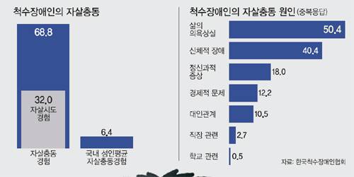 장애를 받아들이지 못해 자살을 생각하기도 한다. ‘2015 척수장애인 욕구 및 실태조사’에 따르면 응답자의 68.8%가 척수 손상 뒤 자살충동을 느꼈다고 답했다. 이는 국내 성인 평균 자살충동 경험률(6.4%·통계청 ‘2016년 사회조사결과’)보다 10배 이상 높은 것이다. 자살을 시도했다는 비율도 32%에 달했다. 자살충동을 느낀 가장 큰 원인(복수 응답)은 ‘삶의 의욕상실’(50.4%)로, ‘신체적 장애’(40.4%)보다도 10%포인트 높았다.