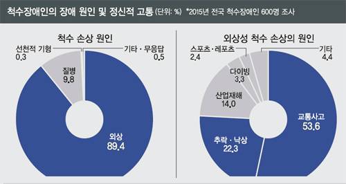 척수장애는 사고나 질병 등으로 척수(척추 내에 위치하는 중추신경의 일부분)가 손상돼 신체와 두뇌 사이의 신경전달통로가 끊어진 장애를 뜻한다. 통상 손상부위 아래의 감각과 운동 기능에 장애가 발생하고 대소변장애, 성기능장애 등 다수의 중복 장애와 합병증을 동반하는 경우가 많다. 보건복지부의 장애인 분류에는 ‘지체장애인’ 속에 포함돼 정확한 실태조사는 이뤄지지 않고 있지만, 한국척수장애인협회는 국내 척수장애인을 전체 인구의 0.1%가량인 8만여명으로 추정한다. 매년 2000명이 척수장애인이 된다. 협회의 ‘2015년 척수장애인 욕구 및 실태조사’에 따르면 장애 원인의 89.4%는 외상이었다. 외상은 교통사고가 53.6%로 가장 많았고 추락이나 낙상 22.3%, 산업재해 14%, 다이빙 3.3%, 스포츠·레포츠 2.4% 등의 순이었다.