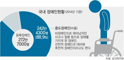 16일 보건복지부에 따르면 2014년 기준 등록장애인은 272만7000명으로 전체 인구의 5.6%다. 이 중 88.9%는 사고나 질병으로 장애를 갖게 된 중도(中道)장애인이다. 특히 하반신 또는 상·하반신이 마비되는 척수장애인은 대부분이 중도장애인이다.