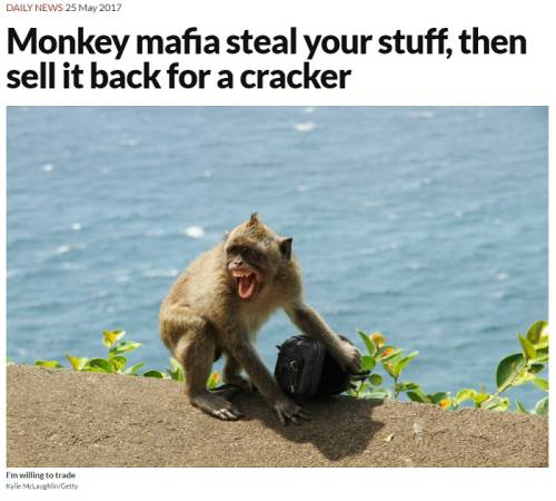 | 인도네시아 유명 휴양지 발리 섬의 긴꼬리원숭이들이 관광객들 물건을 가로채고 먹이를 내놓아야만 소지품을 돌려주는 것으로 알려져 화제다. 영국 과학전문지 뉴사이언티스트 캡처. |