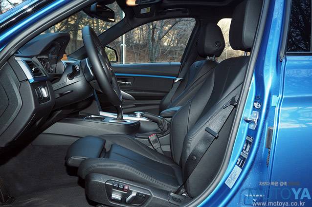 앞좌석에 적용된 M 스포츠 시트는 옆구리를 감싸는 사이드 볼스터의 조절이 가능하여, 버킷시트와 유사한 질감과 경험을 제공한다. 좌석의 가죽은 다소 질긴 느낌의 재질을 사용하고 있으며, 전반적으로 안락함 보다는 탄탄한 착좌감과 급기동에서 운전자의 몸을 잡아주는 역할을 중시하는 설계와 질감을 보인다. 양쪽 좌석은 사이드 볼스터 조절 기능 외에도 각 8방향의 전동조절 기능과 다리받침 조절 기능, 그리고 3단계의 열선 기능을 제공한다. 운전석은 2개의 메모리 기능이 추가된다.