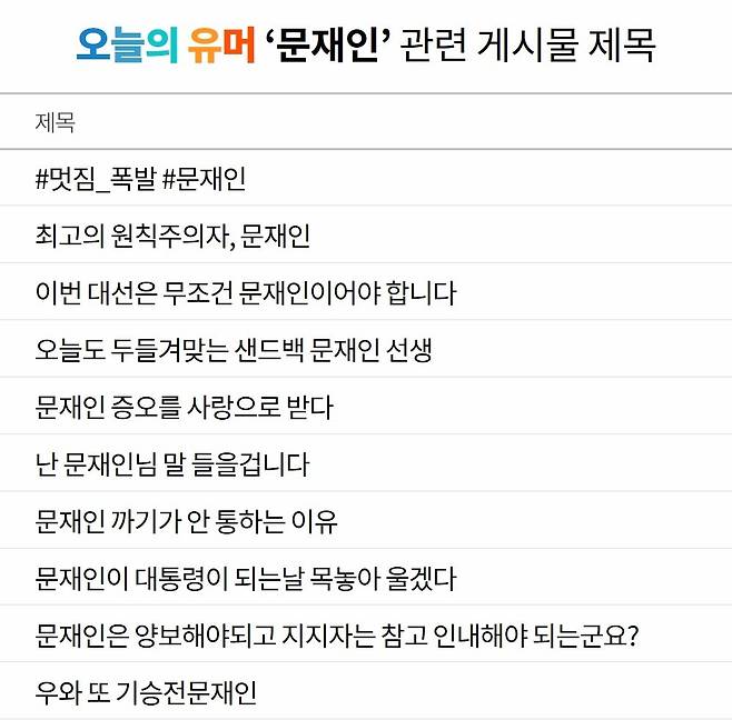 일베가 황 대행에 '희망'을 걸었다면, 문재인 전 더불어민주당 대표를 향한 오유의 감정은 '믿음'입니다. 그래서일까요. 오유는 대선 지지율 1위를 달리는 문 전 대표를 적극 보호하는 모모습입니다. "오늘도 두드려맞는 샌드백 문재인 선생", "문재인은 양보해야되고 지지자는 참고 인내해야 되는군요?"라며 분노하면서도 "문재인 까기가 안 통하는 이유", "문재인 증오를 사랑으로 받다" 등 문 전 대표를 향한 강한 믿음을 내비칩니다. 상당수 오유 이용자는 이 믿음을 원동력으로"#멋짐_폭발 #문재인", "문재인이 대통령이 되는 날 목놓아 울겠다"며 문 전 대표를 지지합니다.