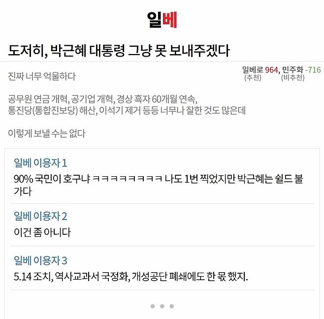 일베는 '최순실 게이트' 파국 중 이어지는 박근혜 대통령 관련 의혹에 혼란한 모습입니다. 재임 중 실책으로 보수층에 찬물을 끼얹었다는 쪽과 뭘 그리 잘못했냐는 쪽으로 양분하고 있죠. '박근혜'를 언급한 제목 중엔 여전히 '뭘 그리 잘못했냐', '김대중, 노무현이 더 나쁘다'는 취지의 발언이 많지만 "박근혜가 XX 착하긴 한 것 같음ㅠㅠ", "도저히, 박근혜 대통령 그냥 못 보내주겠다" 같이 박 대통령을 인간적으로 옹호하는 글엔 부정적 반응이 적지 않은 상황입니다.