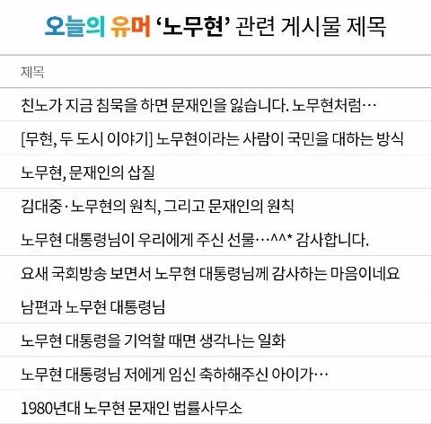 오히려 노 전 대통령에 대한 향수가 더 클 듯한 오유에서 '노무현'은 자주 보이지 않습니다. "노무현 대통령 운전사 근황", "노무현 대통령님 저에게 임신축하해주신 아이가…", "노무현 대통령을 기억할때면 생각나는 일화" 등이 대표적이죠. '노무현'은 이렇듯 과거 추억의 대상으로 간간히 등장하는 모습입니다.
