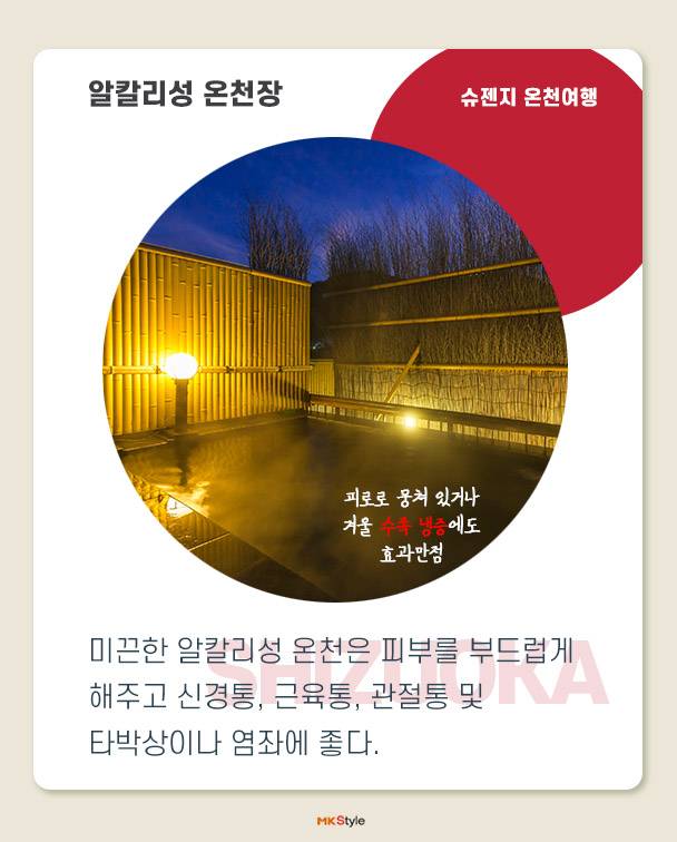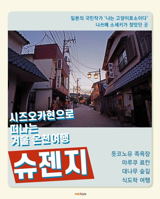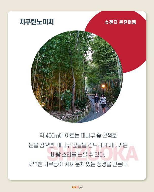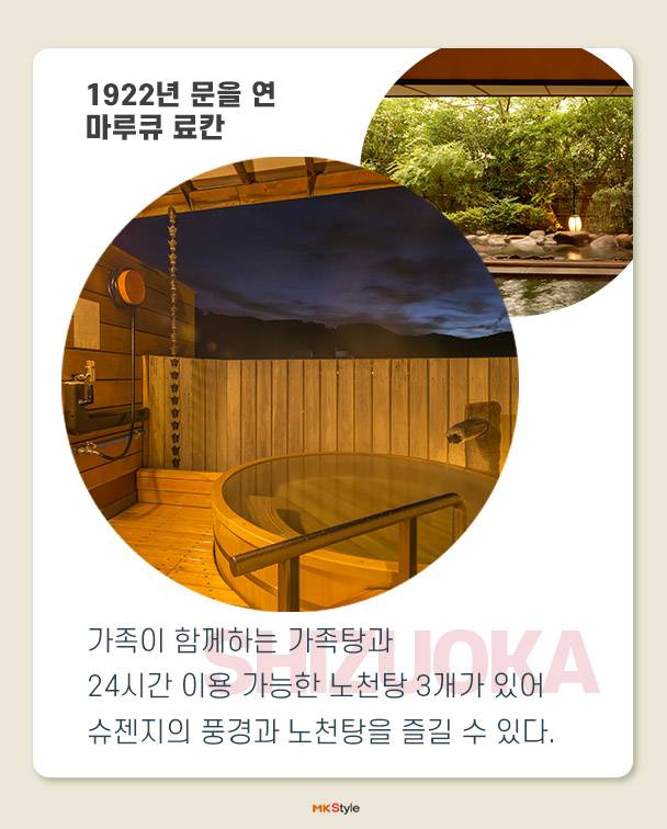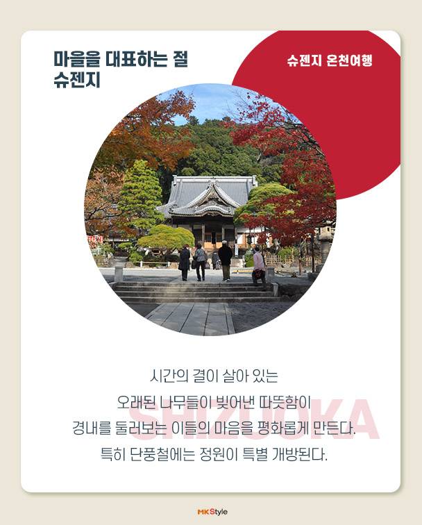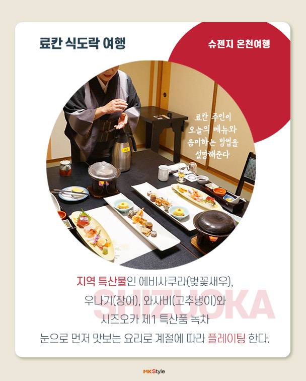 슈젠지 온천 마을은 한가운데를 흐르는 가츠라강을 중심으로 일본 전통 숙박시설인 료칸, 작고 오래된 상점들이 줄지어 있다. 시즈오카 현은 알칼리성 온천수로 피부를 부드럽게 해주고 신경통, 근육통, 관절통, 피로회복, 그리고 겨울이면 수족냉증이 심해지는 이들에게도 효과만점이다. 또한 료칸 식문화의 하나인 ‘가이세키’는 계절 음식으로 맛은 물론이고 요리를 담는 그릇 하나까지 일본 특유의 섬세한 문화를 느낄 수 있다.