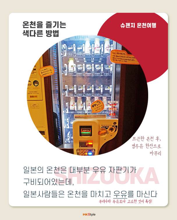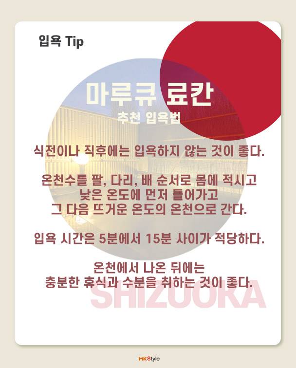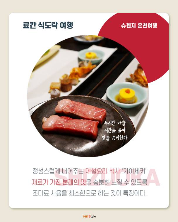슈젠지 온천 마을은 한가운데를 흐르는 가츠라강을 중심으로 일본 전통 숙박시설인 료칸, 작고 오래된 상점들이 줄지어 있다. 시즈오카 현은 알칼리성 온천수로 피부를 부드럽게 해주고 신경통, 근육통, 관절통, 피로회복, 그리고 겨울이면 수족냉증이 심해지는 이들에게도 효과만점이다. 또한 료칸 식문화의 하나인 ‘가이세키’는 계절 음식으로 맛은 물론이고 요리를 담는 그릇 하나까지 일본 특유의 섬세한 문화를 느낄 수 있다.
