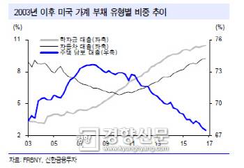 신한금융투자는 “현재로선 학자금, 자동차, P2P 대출이 비중이나 건전성, 파급효과 측면에서 금융시장을 위협하는 수준은 아니다”라면서도 “미국 금리 인상기에 가계 부채 상환능력이 온전할지, 이에 대비할 채권자들의 여력은 충분한지 가늠이 어려워 중장기적으로 지속적인 관심이 필요하다”고 지적했다.