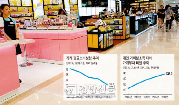 한국은 어떤가. 한국은행에 따르면 지난해 가계신용(가계대출+판매신용) 증가율은 11.7%로 2015년(10.9%)에 이어 2년 연속 두 자릿수 증가율을 기록했다. 가계신용의 연간 증가액도 2013년 55조2000억원→2014년 66조3000억원→2015년 117조8000억원→2016년 141조2000억원으로 점점 커지고 있다. 반면 소득은 제자리걸음이다. 통계청 자료에 따르면 가구당 월평균 소득 증가율(전년 동기 대비)은 지난해 1분기 0.8%, 2분기 0.8%, 3분기 0.7%에 그쳤다. 물가상승을 감안한 실질소득은 마이너스 수준이다. 소득은 그대로인데 빚만 늘어난 가계는 지갑을 열지 못하고, 이는 민간소비를 위축시키는 요인으로 작용하고 있다. 현대경제연구원에 따르면 올해 가계부채는 소비증가율을 0.63%포인트 떨어뜨릴 것으로 추산됐다.