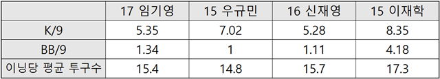 * 17시즌 임기영과 주요 사이드암 선발들의 K/9, BB/9 등 기록 비교
