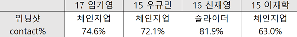 * 17 시즌 임기영과 주요 사이드암 선발들의 위닝샷 contact% 비교