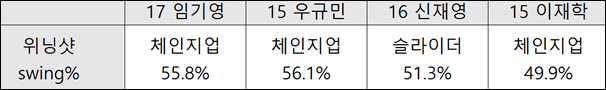 * 17 시즌 임기영과 주요 사이드암 선발들의 위닝샷 swing% 비교