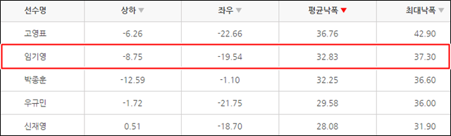 이 뿐 아니라 임기영의 체인지업은 낙폭도 리그 정상급이다. 평균 낙폭이란 특정 구종이 평균적으로 몇 cm나 떨어지는지 측정한 값인데, 임기영의 체인지업은 평균 낙폭이 32.83cm로 체인지업을 구사하는 선발 투수 중 2위로 최상위권이다. 볼을 던져도 타자가 종종 스트라이크로 오인할 만큼 낙폭이 큰 체인지업을 구사하는 것이다.