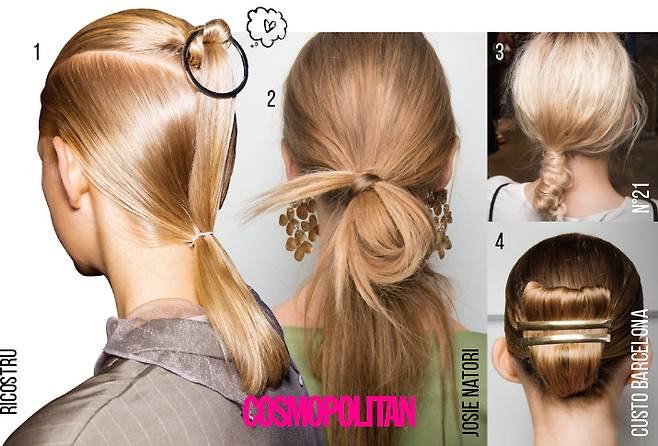 1 2단 묶기 이마 라인에서 한 번, 목 뒤에서 한 번 더 묶는 2단 묶음 스타일은 심플하게 재미를 줄 수 있는 방법. 액세서리를 추가하면 화룡점정!2 초시크하게 묶기한 가닥으로 묶은 다음, 모발의 반만 잡고 묶어둔 고무줄 사이로 끼워 넣기만 하면 초시크 룩 완료.3 솥뚜껑처럼 묶기솥뚜껑 손잡이 아닙니다! 한 가닥으로 묶은 뒤 모발을 안으로 접어 넣고, 모발 몇 가닥을 빼내 둘둘 말아 위트 있게 연출해볼 것.4 액세서리로 묶기반듯하게 묶은 머리를 좌우로 펼친 다음 심플한 핀 2개를 꽂으면 에지 있는 업두 스타일로 변신.