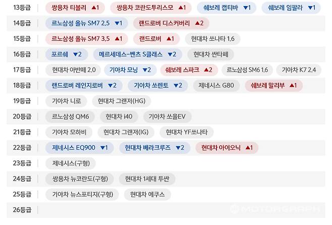 더넥스트스파크(17등급)/티볼리(13등급)/아베오(10등급)/아반떼AD(16등급)/뉴K5(17등급)/스포티지QL(17등급)/말리부(12등급)/SM62.0(15등급)/코란도C(15등급)/말리부2.4(16등급)/SM52.5(18등급)/올뉴카렌스(12등급)/더뉴카렌스(12등급)