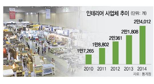 통계청에 따르면 2014년말 현재 국내에 등록된 인테리어 사업체는 약 2만4,000여곳. 이 가운데 10인 미만 사업체가 차지하는 비중은 무려 94%에 달한다. 1인 자영업이거나 소규모 업체이다보니 관련법이 규정하는 실내건축공사업 자격증을 받기 위한 최소 요구 자본금 2억원을 맞추지 못하고 있는 실정이다.