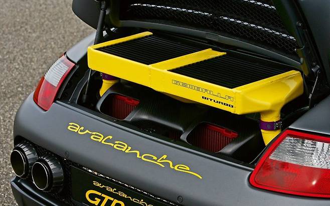 겜발라 아발란체는 포르쉐 911(991.2) 터보에 기반을 둡니다. 앞-뒤 범퍼, 사이드 스커트, 리어 스포일러 등 여러 부분이 역동적인 모습으로 바뀝니다. 공기역학도 물론 충분히 고려해서 만들어졌죠. 엄청난 크기의 머플러가 눈에 띕니다.