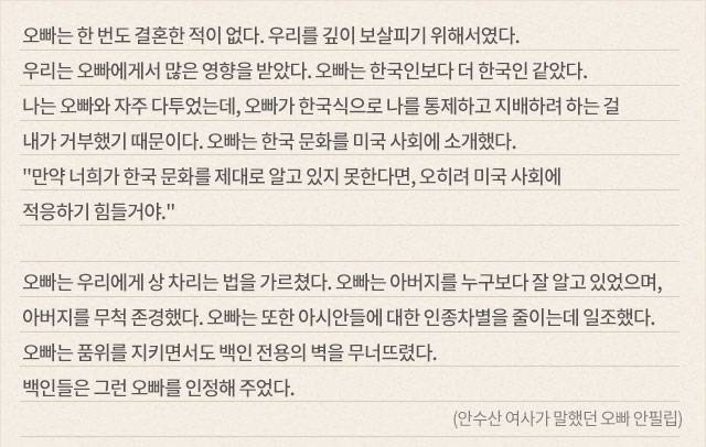 "어느 날 아버지, 아버지 친구분과 함께 LA 동쪽 윌슨 산으로 소풍을 갔어요. 다른 아이들과 놀고 있다가 보니 아버지가 그 친구분과 함께 애국가를 쉴 새 없이 부르셨어요. 계속해서 부르고 또 부르고… 그러다 결국에는 엉엉 소리 내서 우시더군요. 저도 영문도 모른 채 그냥 슬퍼서 같이 따라 울었어요. 아마 그때야 아버지의 삶을 언뜻 이해하게 됐는지 몰라요."