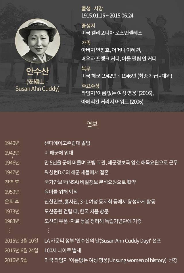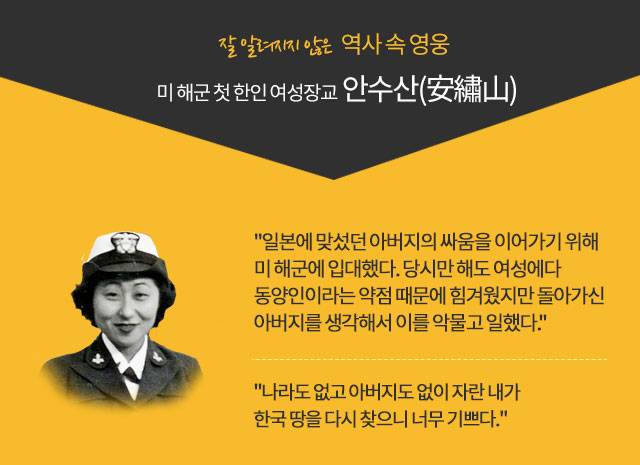 1940년 캘리포니아에서 대학을 졸업한 안수산 여사는 태평양 전쟁이 발발하자 1942년 미 해군에 입대했다. 동양인이라 한 차례 거부당하면서도 기어이 사관후보생이 되었고, 미 해군 역사상 첫 여성 장교가 됐다. '키 작은 아시아 여성'이라는 편견에 늘 부딪혀야 했지만, 후방 지원부서가 아닌 전투병과를 자원해 대공포병 장교로 활약했다. 그는 성·인종 차별주의와의 싸움이 가장 격렬했던 자리를 스스로 선택해 주눅들지 않고 맞선 개척자였다.
