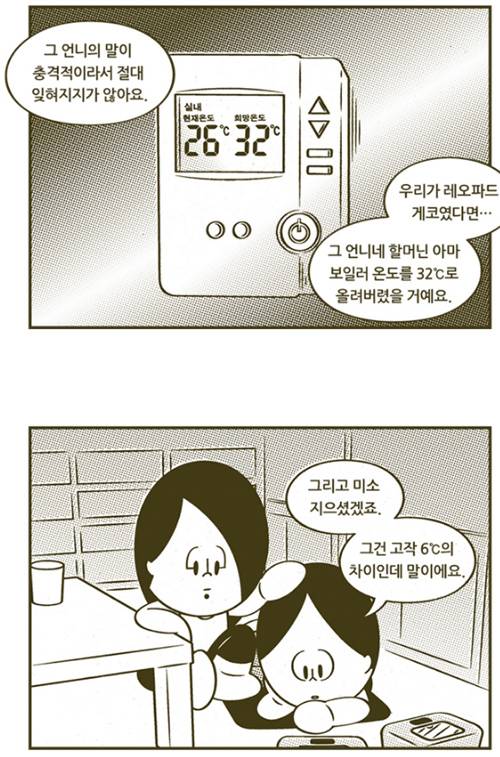 수필적이고 소설적인 면모도 빛난다. 지금껏 일상툰 혹은 생활툰이라고 명명되던 장르의 작품들은 소설적 허구를 가미한 수필의 형식에 가까웠다고 할 수 있는데, 그런 만큼 주인공은 작가의 페르소나로 손쉽게 이해되곤 했다. 하지만 <혼기법>은 수필의 발화 방식을 빌려 써나가면서도 그 발화자를 작가의 페르소나가 아닌 소설적인 허구의 인물로 배치하고 있다는 점을 명백히 한다. 처음 이시다로 시작한 1인칭으로 발화하는 인물이 옆집 해수로, 시다의 동생 시리로 늘어나면서 수필로서의 면모와 소설로서의 면모도 더불어 짙어진다. 삶의 사실들을 자신의 이야기로 길어내는 것이 수필이라면, 삶의 사실을 허구의 서사와 인물에 옮겨 삶의 진실을 풀어내는 것이 소설이다. <혼기법>은 영리하게 두 형식의 효과를 모두 끌어낸다. 그래서 더할 나위 없이 핍진하면서도, 수필과 소설이 담아내야 할 것으로 믿어지는 사실성과 개연성의 족쇄를 벗는다. ‘사실’만을 담을 필요도, ‘말이 되는’ 전개를 만들 필요도 없으므로 역설적으로 이야기를 이어가는 데 충분한 사실성과 개연성을 부담 없이 성취해 내는 것이다.