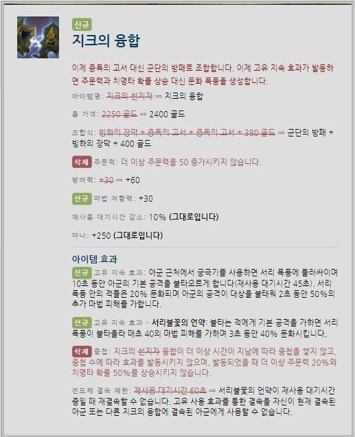아이템 '지크의 선지자'는 '지크의 융합'으로 재탄생했다. 지크의 융합은 아이템에 붙은 50의 주문력이 삭제되는 대신 마법 저항력을 30 증가시키며 탱커형 아이템으로 변경됐다.