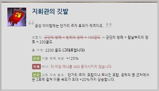 '지휘관의 깃발'은 포탑이나 무너진 포탑, 공허의 문 근처에서 2초에 걸쳐 이동 속도가 최대 20%까지 상승하도록 바뀌었다. 포탑 대치전이나 스플릿 운영에 유용한 셈인데 어울리는 서포터 챔피언에 대한 연구가 필요할 것으로 보인다.