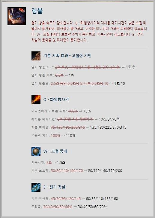 강력한 라인전 능력과 이니시에이팅에 효과적인 궁극기 덕분에 사랑 받는 럼블이 하향됐다. '기본 지속 효과 - 고철장 거인'이 변경되며 열기 방출 시작과 속도, 방출량이 모두 하향됐다. Q스킬 '화염방사기'는 저레벨 구간의 피해량이 증가했으나 재사용 대기 시간과 미니언에게 가하는 피해가 100%->75%로 감소하며 위력을 견제했다.