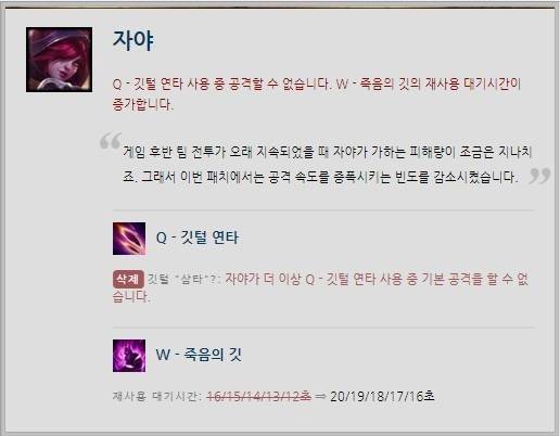 자야는 Q스킬 '깃털 연타'를 사용하면서 기본 공격을 할 수 없도록 변경됐다. 동시간에 깃털 3개를 날려 E스킬과 연계하는 자야의 콤보를 억제한 것이다. W스킬 '죽음의 깃'은 재사용 대기 시간이 스킬 레벨 당 16/15/14/13/12초에서 20/19/18/17/16초로 늘어났다.