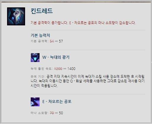 킨드레드는 원거리 딜러형 정글러로 변경하겠다는 라이엇 게임즈의 의지와는 상관없이 강력한 모습을 보여주지 못하고 있다. 이에 7.12 패치에서 기본 공격력이 54에서 57로 증가되고, W스킬 '늑대의 광기'의 늑대 돌진 속도와 E스킬 '차오르는 공포'의 마나 소모량이 모두 상향되며 반등을 꾀했다.