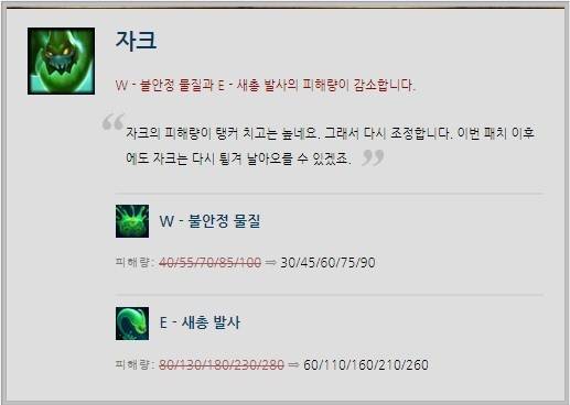 LoL 챔피언스 코리아(이하 롤챔스) 2017 서머에서 밴픽율 100%를 기록하고 있는 자크는 피해량이 중점적으로 하향됐다. W스킬 '불안정 물질'의 피해량이 스킬 레벨 당 40/55/70/85/100->30/45/60/75/90으로 바뀌었고 E스킬 '새총 발사' 또한 전 레벨 구간의 피해량이 20씩 줄었다.