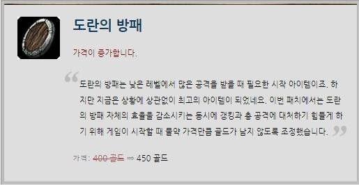서포터 아이템은 아니지만 최근 변경된 뒤 좋은 평가를 받아 톱 라이너는 물론 원거리 딜러까지 애용한 '도란의 방패'의 가격이 400 골드에서 450 골드로 변경됐다. '도란의 방패'를 구입한 이용자들은 포션 없이 라인전에 임해야 하는 위험을 부담해야 한다.