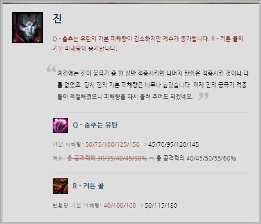 진은 피해량과 관련돼 상향이 있었다. Q스킬 '춤추는 유탄'의 기본 피해량이 조금 깎였으나 전반적인 계수가 증가했고, 궁극기 '커튼' 콜의 탄환 당 기본 피해량 또한 스킬 레벨 당 40/100/160에서 50/115/180으로 상향됐다.