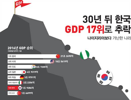 회계컨설팅 네트워크 PwC와 삼일회계법인의 '2050 세계 경제 장기 전망-세계 경제순위 변화' 보고서에 따르면 2050년 한국의 GDP 순위는 세계 17위로, 이집트나 나이지리아보다도 떨어질 것으로 예상됐다.