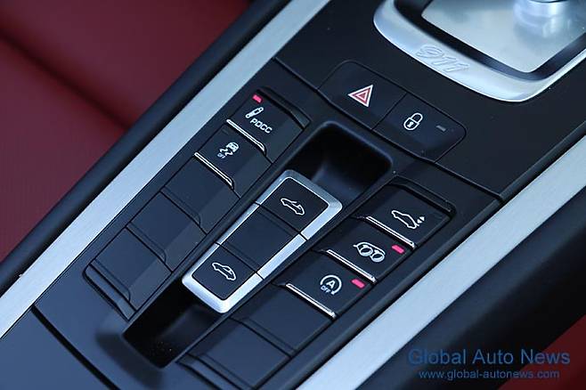 다이얼 타입의 SRB(SRB : Sport Response Button )는 옵션인 스포츠 크로노 패키지를 선택하면 설정된다. 918스파이더에서 보았던 것이다. 모드 스위치는 Normal 과 Sport, Sport+, Individual 의 4개가 있다. “I”를 선택하면 장비에 따라 PASM, 액티브 엔진 마운트, PDK 변속, 스포츠 배기 시스템 등 운전자가 원하는 맞춤형 설정이 가능하다.