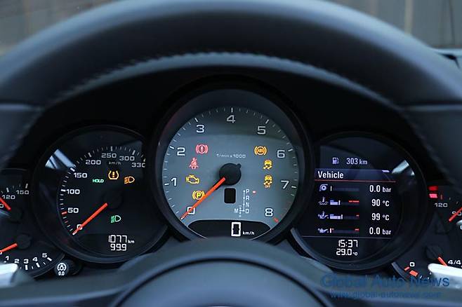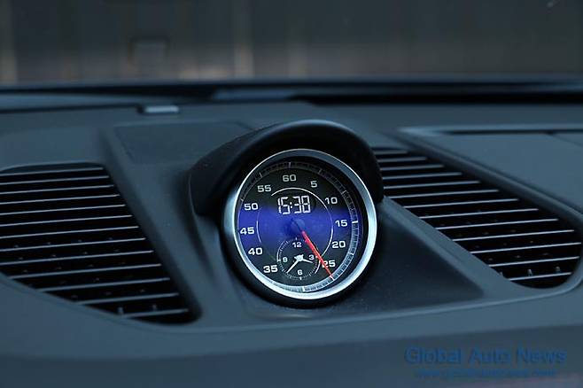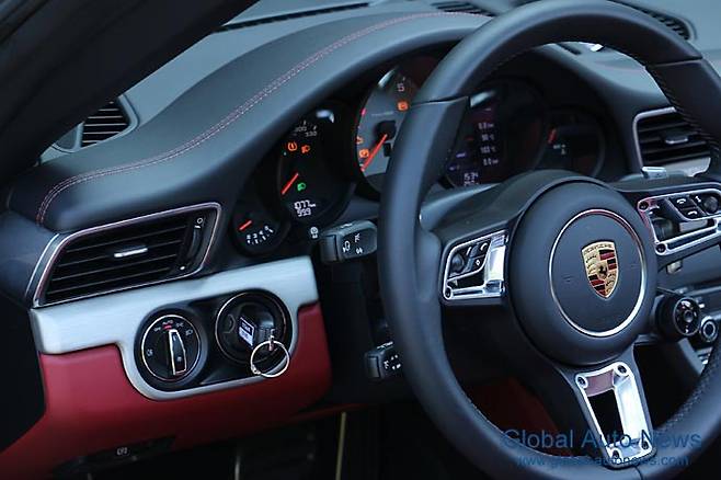 3스포크 스티어링은 918스파이더풍의 휠 모드 스위치가 채용되어 있다. 휠과 그 뒤 패들 시프트, 선대 모델인 997 데뷔시 처음 적용했던 틸팅 기능과 가변비 랙&피니언 방식은 그대로다. 대시보드 상단 중앙에는 스포츠 크로노 패키지는 여전히 포르쉐의 아이덴티티로 역할을 수행하고 있다.